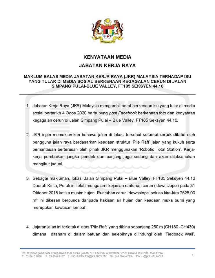 Kkr Malaysia On Twitter Maklum Balas Media Jabatan Kerja Raya Jkr Malaysia Terhadap Isu Yang Tular Di Media Sosial Berkenaan Kegagalan Cerun Di Jalan Simpang Pulai Blue Valley Ft185 Seksyen 44 10 Https T Co Ukcvm92grf
